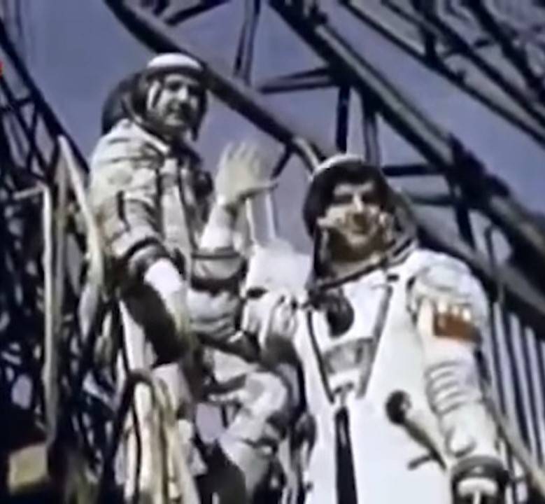 Left: Mir’s first resident crew, Leonid D. Kizim, left, and Vladimir A. Solovyov, prepare to board their