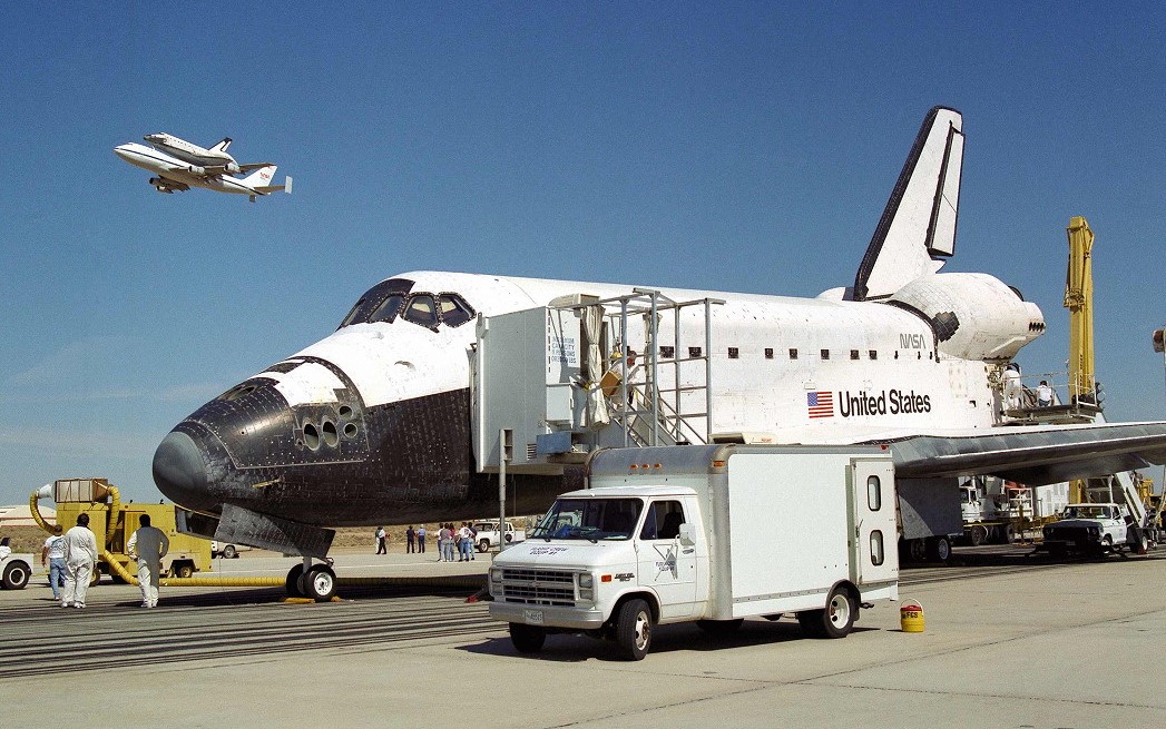 Left: As workers process Endeavour on the runway, Columbia atop a Shuttle Carrier Aircraft (SCA) flies overhead on its way to the Palmdale facility for refurbishment. Right: Mounted atop an SCA, Endeavour departs Edwards for the cross-country trip to NASA’s Kennedy Space Center in Florida.