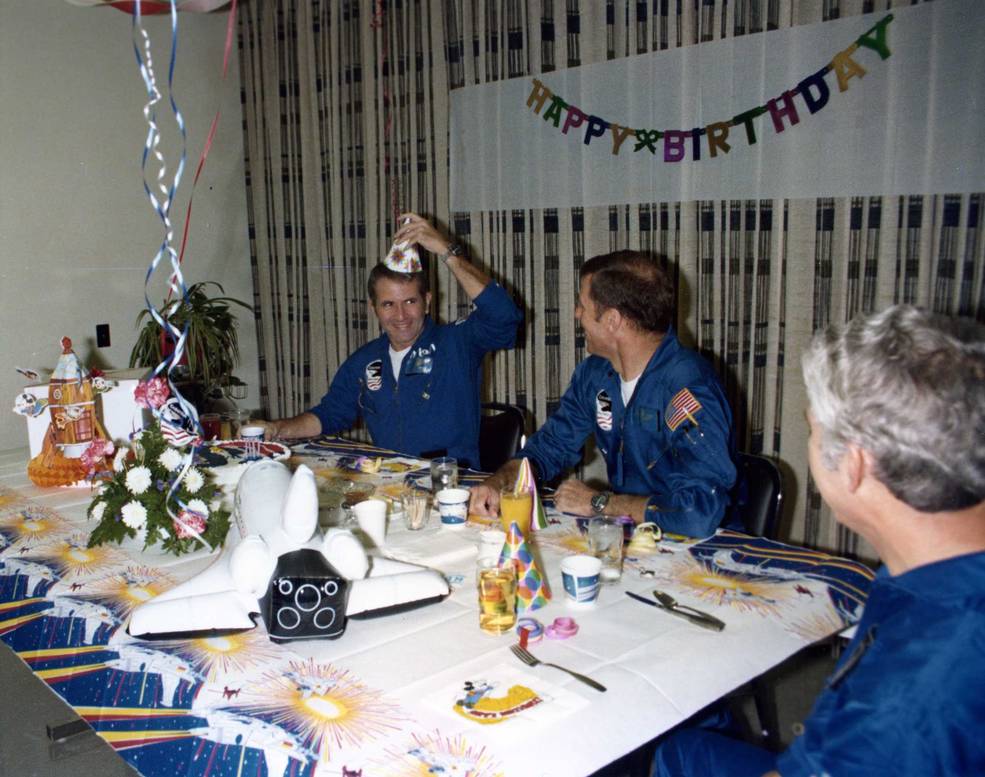 Left: STS-2 astronauts Richard H. Truly, left, and Joe H. Engle enjoying the traditional prelaunch breakfast, the room decorated in honor of Truly’s 44th birthday. Middle: Following breakfast, Truly, left, and Engle don their pressure suits, this room also decorated to celebrate Truly’s birthday. Right: Truly, left, and Engle in the White Room at Launch Pad 39A, also festooned with a birthday greeting.