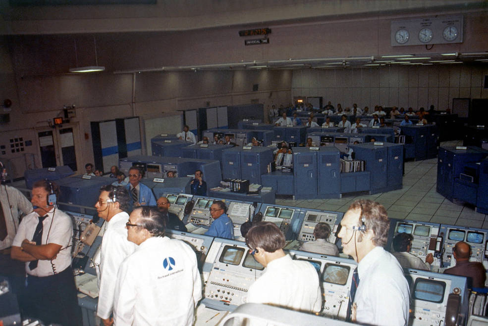 View of Mission Control at NASA’s Johnson Space Center in Houston after the landing of Columbia, ending the STS-2 mission.