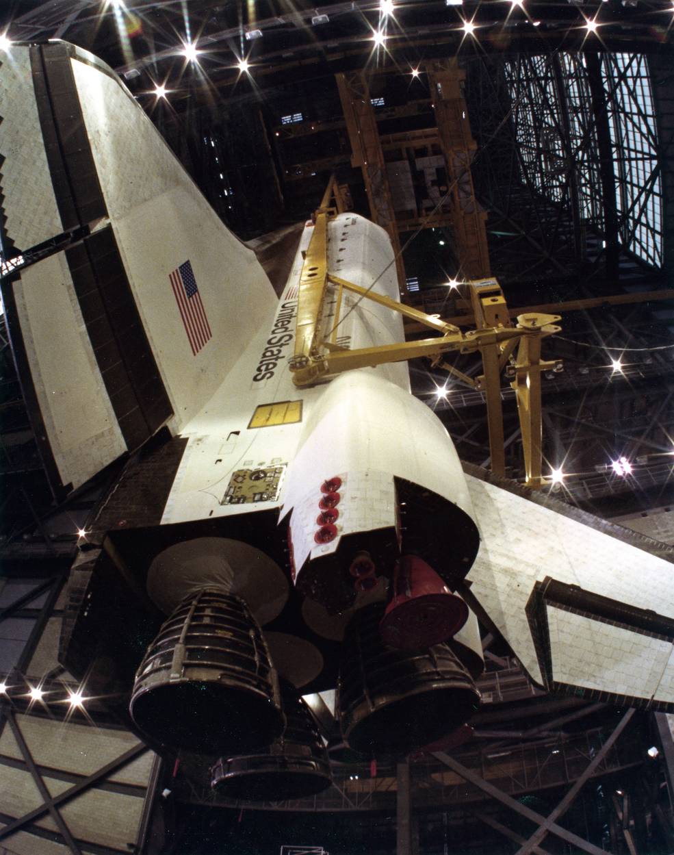 Inside KSC’s cavernous Vehicle Assembly Building (VAB), workers continued to assemble the large components of the space shuttle stack to prepare for Columbia’s first flight. They had stacked the twin Solid Rocket Boosters (SRBs) on the Mobile Launch Platform in January 1980. Beginning Nov. 2, they lowered the External Tank (ET) between the two SRBs and bolted them together, an operation that took about two days. In the nearby Orbiter Processing Facility (OPF), engineers reinstalled the three Space Shuttle Main Engines (SSMEs) onto Columbia and bonded the final 300 heat-resistant thermal protection system tiles to the orbiter’s exterior. Prime crew members Young and Crippen thanked workers in the OPF after the tile work was completed. Said Young, “We’ve come to pay tribute and give a word of thanks and a hardy well done to the people who worked on this spaceship. It’s a beautiful vehicle.”
