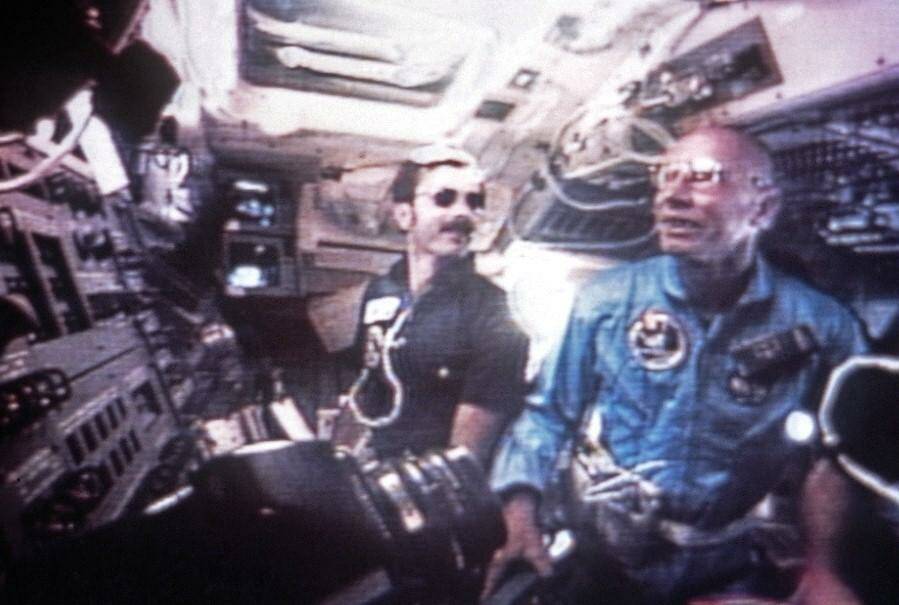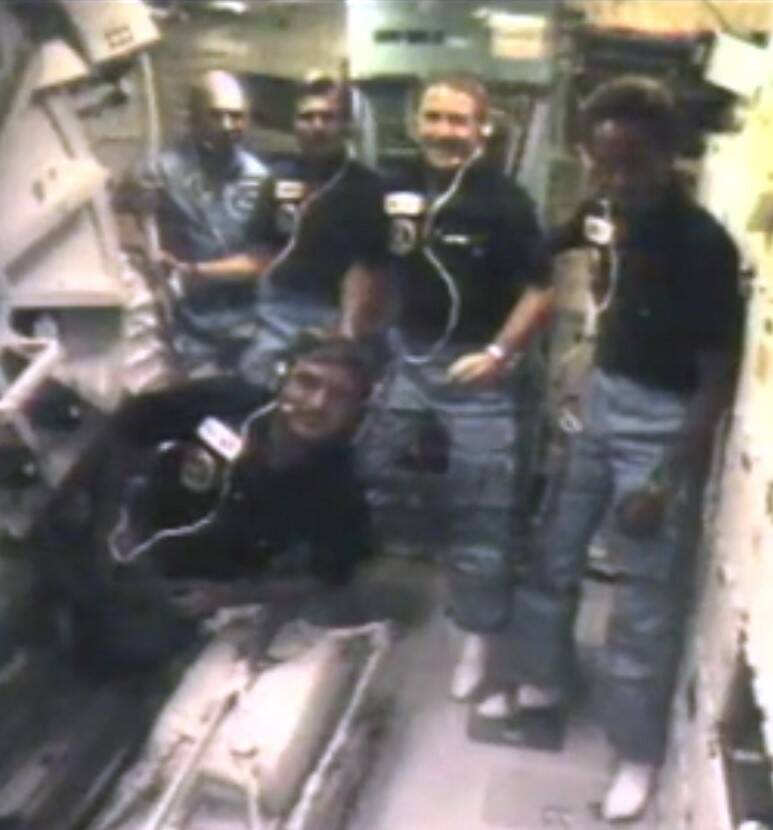 Mission Control began the astronauts’ fifth day in space by playing the University of North Carolina Fight Song for alum Thornton. Brandenstein passed along Thornton’s “good morning” to Mission Control, adding that “he’s already hard at work in his office,” meaning he had already begun his data gathering in the middeck. The astronauts photographed a phenomenon call tail glow, when the aft end of the shuttle seems to glow from interaction with atomic oxygen and most prominent following thruster firings. Truly and Brandenstein completed a star tracker acquisition test to aid in shuttle navigation. All five crew members participated in an inflight press conference with six reporters at JSC, the 24-minute event made possible by TDRS that enabled live TV of the crew. When a reporter asked Truly for his assessment of STS-8’s contribution to the overall space shuttle program, he responded, “You have to really remember that this press conference is coming from space in the most complicated machine in the world, and while we all have been down here for how many minutes, it runs itself. We really have made great strides, I think. And I think it’s a great future for America in space.” When asked if his studies had revealed anything new about space motion sickness, Thornton replied, “I have learned more in the first hour and a half on orbit here than I had by all of the literature research that I’d done and all the active work in the past year.” Following the press conference, Truly picked up the PFTA, operating the RMS in manual mode, meaning without computer assistance, and then handed control of the RMS to Gardner to finish the task by stowing the PFTA. Gardner then commanded the RMS to conduct a videotaped survey of the underside of the orbiter, an activity never performed before. Thornton conducted a video demonstration of his various experiments, with his crewmates actively participating. At the end of the day, he provided his usual summary of another busy day of data collection. The crew then settled down for a good night’s sleep.
