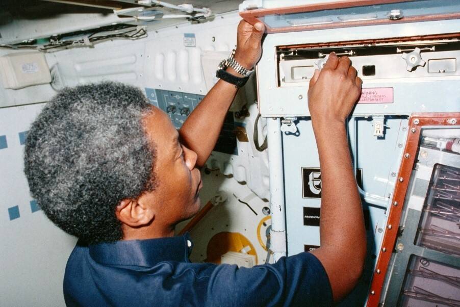 On Aug. 30, Challenger and its crew thundered into the night sky at KSC, only the second night launch in the American human space flight program – the first was Apollo 17 in 1972. As soon as the shuttle cleared the launch tower, control of the flight shifted from KSC to Mission Control at NASA’s Johnson Space Center (JSC) in Houston, where Flight Director Jay H. Greene led his Emerald Team of controllers that monitored every aspect of the mission. Bryan D. O’Connor, assisted by Guy S. Gardner, served as the capsule communicator, or capcom, the astronaut who talks directly with the crew. Following the powered ascent and two burns of Challenger’s Orbital Maneuvering System (OMS) engines, the astronauts had safely reached orbit. They removed their helmets, unstrapped from their seats, and completed the first major task, opening the payload bay doors that also deployed the radiators to cool the shuttle. They also connected the communications system to TDRS, with excellent quality and nearly doubling the time when the shuttle could communicate with Mission Control. Gardner activated the RMS and completed an initial checkout, and in the middeck Bluford activated the CFES to begin the first experiment session. Thornton began his series of medical investigations, with crew members coming in and out of his “clinic” for various studies. In Mission Control, Greene’s team handed off to Harold “Hal” M. Draughon and his Crystal Team with John E. Blaha taking over as capcom, assisted by Dr. William F. Fisher. The astronauts gathered in the middeck for a television broadcast, with all of them sporting three white dots on their foreheads – electrodes for Thornton’s eye movement experiment. At the end of the crew’s day, Thornton reported on the success he had with several of his experiments. After that, the astronauts began their first sleep period in space. A change of shift took place in Mission Control to Flight Director Greene’s Emerald Team, with O’Connor returning as capcom. Near the end of the astronauts’ sleep period, another change of shift took place, with Flight Director Brock R. “Randy” Stone’s Amber Team taking their consoles to see the astronauts through their busy second flight day.