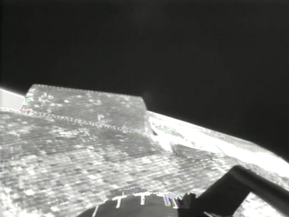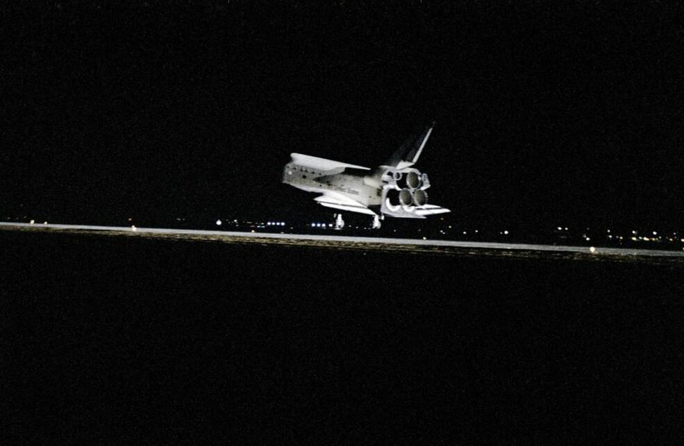 Entry and landing day for STS-8 fell on Sept. 5, 1983, the Labor Day holiday. Mission Control awakened the crew with “Semper Fidelis”, written by John Philip Sousa and played by the Marine Corps Band, in honor of capcom O’Connor, a Marine Corps officer, then on console. Truly called down that the music had “everybody marching around up here.” The Gray Team led by Entry Flight Director Gary E. Coen, with Blaha serving as capcom, took their consoles to guide Challenger and its crew home to the first night landing in the shuttle’s history. The astronauts completed stowing some final items in the cabin, closed the payload bay doors, and Truly oriented Challenger with its tail facing in the direction of flight. Flying over the Indian Ocean, the astronauts fired Challenger’s two OMS engines for two and a half minutes to bring them out of orbit. Truly then reoriented the spacecraft so it flew nose first, presenting its underside covered with thermal protection tiles to take the heat of reentry. Challenger reached the first layers of the atmosphere at 400,000 feet altitude, and entered a period of communications blackout as the heated plasma surrounding the vehicle prevented signals from getting through. They emerged from the blackout at 278,000 feet, traveling at Mach 12, or 12 times the speed of sound. They crossed the California coast over Santa Barbara, and with the clear night could clearly see the lights of Los Angeles in the distance. Challenger dropped below the speed of sound, announcing its arrival with a double sonic boom, heard by observers who still could not see it in the predawn darkness. At 40,000 feet, Challenger intersected the heading alignment circle to make the sweeping left turn onto Runway 22 at Edwards AFB. An infrared tracking camera picked up Challenger, its nose cone still glowing hot from reentry. Brandenstein lowered the craft’s landing gear and Truly brought Challenger down for a smooth touchdown, the orbiter finally visible in the runway’s halogen lights. After rollout, he reported “wheels stop,” signaling that Challenger and its crew had safely arrived home after circling the Earth 98 times, in a mission lasting six days, one hour, nine minutes.