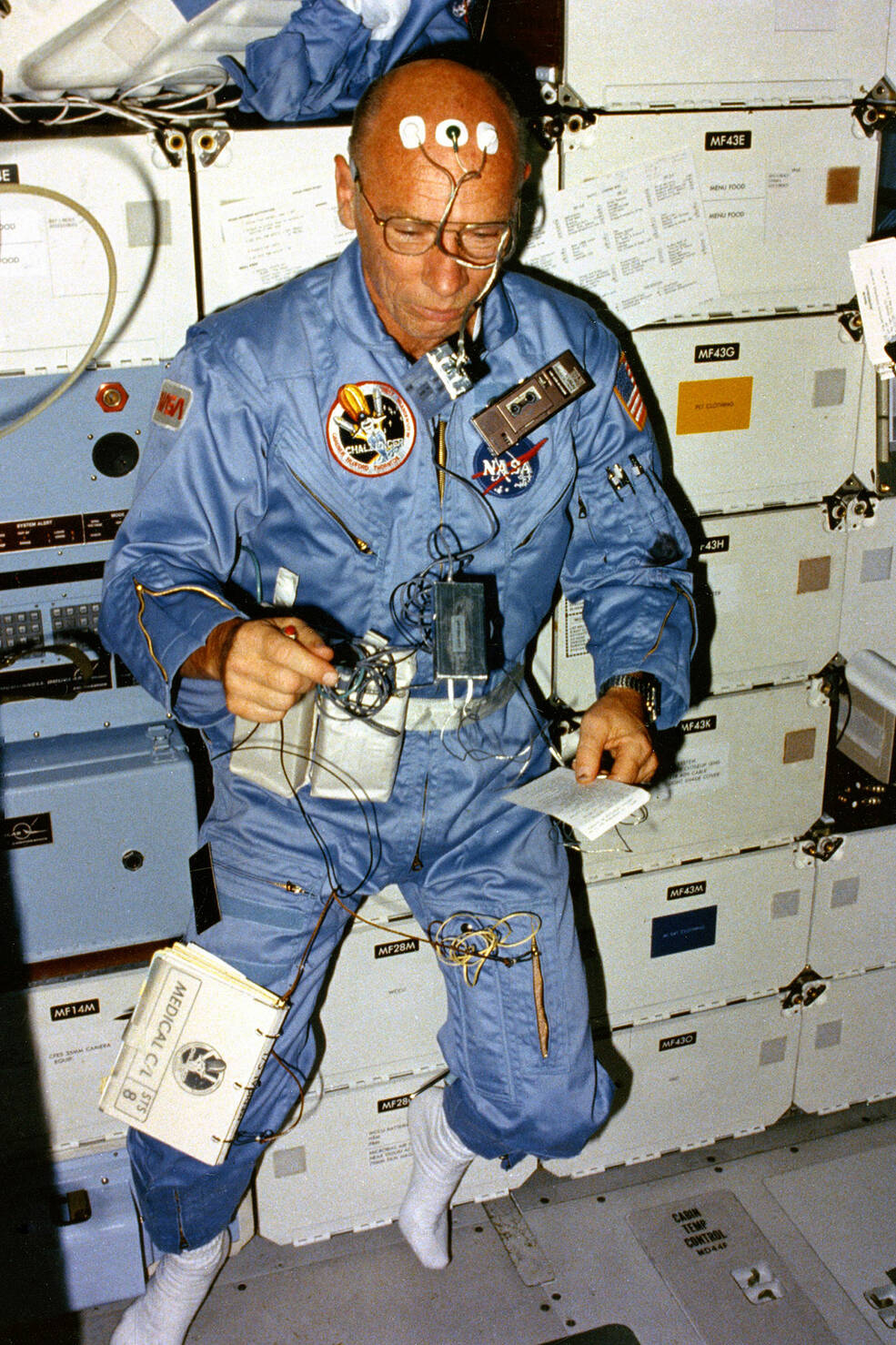 Left: Physician-astronaut Dr. William E. Thornton fully instrumented to conduct several of his inflight studies. Middle left: Thornton gathers a very long strip chart from one of his recordings. Middle right: Thornton conducts an audiometry or hearing evaluation on fellow crew member Dale A. Gardner. Right: Thornton measures leg volume changes on Richard H. Truly to document the headward shift of body fluids in weightlessness.