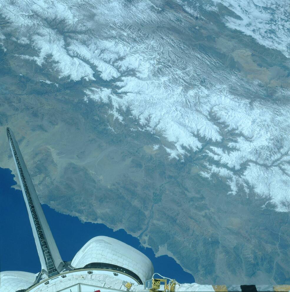 Left: The Payload Flight Test Article at the end of the Remote Manipulator System during the first day of testing. Middle: The Kalahari Desert in Namibia. Right: Dr. William E. Thornton, right, takes a break from his medical studies in the middeck to observe the PFTA activities and take in the scenery of the Earth.