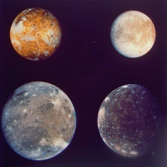 Right: Composite image of Jupiter’s four large Galilean satellites, shown to scale (clockwise from top left) Io, Europa,