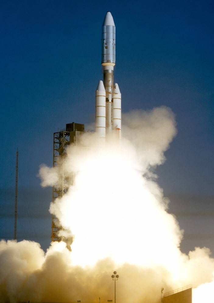 Left: Launch of Voyager 1. Middle: Model of the Voyager spacecraft.