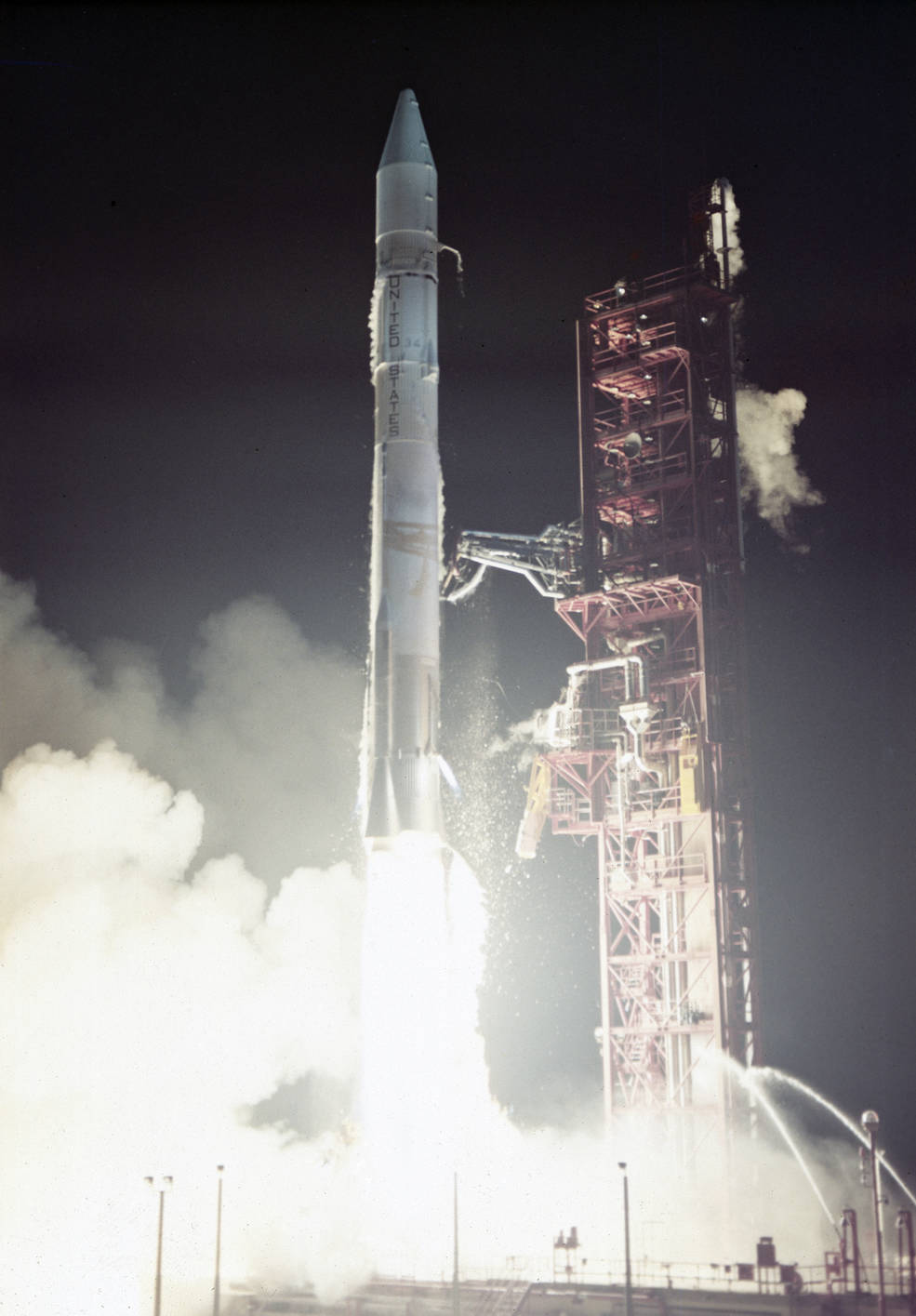 Mariner 10’s goals at Venus were to add to existing information, such as closeup photography revealing the structure of the upper atmosphere, while at Mercury it was to conduct a more global survey of the planet. To accomplish these and other goals, Mariner 10 carried out seven scientific experiments—the television photography system consisting of two telescopes to image the planets; an infrared radiometer to calculate the temperature of Venus’ atmosphere and Mercury’s surface; an ultraviolet spectrometer primarily to detect any atmosphere around Mercury; plasma detectors to study the solar wind inside the orbit of Venus for the first time; a charged particle telescope to study cosmic radiation; magnetometers to detect any magnetic field around Venus and Mercury; and a celestial mechanics and radio science experiment to investigate Venus and Mercury’s mass and gravitational characteristics. As the spacecraft passed behind Mercury, its radio signals were used to determine if the planet had an atmosphere and precisely measure its radius. By precisely tracking the spacecraft’s trajectory as it passed Mercury, the planet’s mass and gravitational characteristics could be determined.
