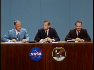 On Aug. 12, Armstrong, Aldrin, and Collins entered MSC’s Auditorium to a capacity crowd of reporters and TV crews who saluted them with a standing ovation. Armstrong set the stage for the press conference with the following opening statement,