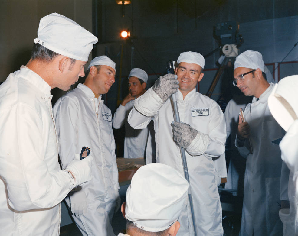 During a press conference at MSC on Oct. 11, Conrad, Gordon, and Bean provided an overview of their mission to assembled reporters. They announced the call signs they would use during the flight to differentiate between the two spacecraft – their Command and Service Module they named Yankee Clipper and their LM Intrepid. They selected the names from entries submitted by employees of North American Rockwell Space Division and of Grumman Aerospace Corporation, prime contractors for the CSM and LM, respectively. Throughout October, the three astronauts conducted numerous training runs in the spacecraft simulators and several sessions practicing for the lunar surface EVAs.