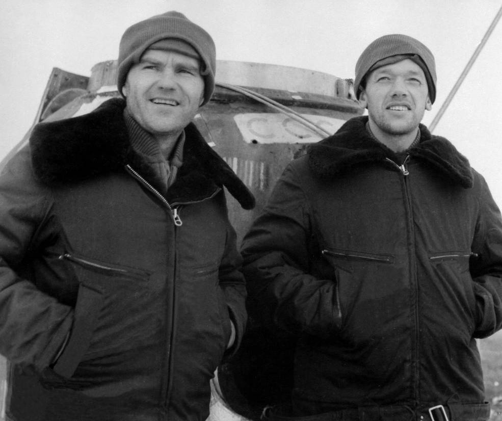 Left: Soyuz 6 cosmonauts Shonin (left) and Kubasov shortly after landing. Middle: Soyuz 7 cosmonauts (left to right) Filipchenko, Volkov, and Gorbatko shortly after landing. Right: Soyuz 8 cosmonauts Shatalov (left) and Yeliseyev standing in front of their capsule shortly after landing.
