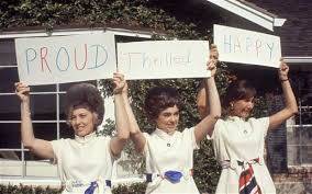 Left: Apollo 12 astronauts’ wives (left to right) Sue Bean, Barbara Gordon, and Jane Conrad hold up signs for reporters. Right: Apollo 12 astronauts (left to right) Gordon, Conrad, and Bean aboard Yankee Clipper during the inflight press conference on the way home from the Moon.