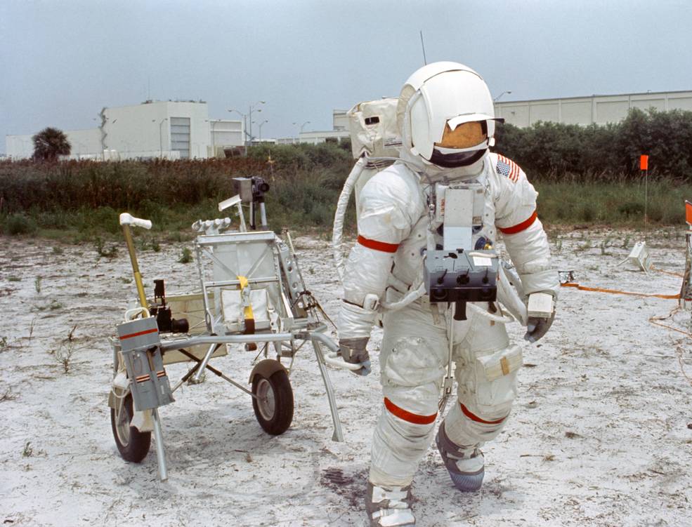 On June 30, 1970, NASA Administrator Thomas O. Paine announced the slip of the Apollo 14 launch to Jan. 31, 1971. The two-month delay resulted from changes required to the Apollo spacecraft recommended by the Apollo 13 Review Board that investigated the causes of an oxygen tank explosion while the crew was on its way to the Moon. The recommendations included changes to eliminate potential combustion hazards in the Service Module’s (SM) high-pressure oxygen tank and the installation of a third oxygen tank for added redundancy. Engineers in KSC’s Manned Spacecraft Operations Building (MSOB) began implementing the modifications in late July. In KSC’s Vehicle Assembly Building (VAB) workers stacked the Apollo 14 Saturn V’s rocket third stage in mid-May and began testing the assembled vehicle, awaiting the spacecraft once engineers finished its modifications and testing. The Apollo 14 prime crew of Commander Alan B. Shepard, Command Module Pilot (CMP) Stuart A. Roosa, and Lunar Module Pilot (LMP) Edgar D. Mitchell as well as their backups Eugene A. Cernan, Ronald E. Evans, and Joe H. Engle conducted altitude tests of their Lunar Module (LM) and Command Module (CM) in the MSOB’s vacuum chambers. They ran simulations of various aspects of their mission and the Moon walkers practiced tasks for their lunar surface Extravehicular Activities (EVA) such as deploying the Apollo Lunar Surface Experiment Package (ALSEP) suite of scientific instruments and using the Modular Equipment Transporter (MET), a two-wheeled conveyance to ease the burden of carrying tools and rock samples over long distances.