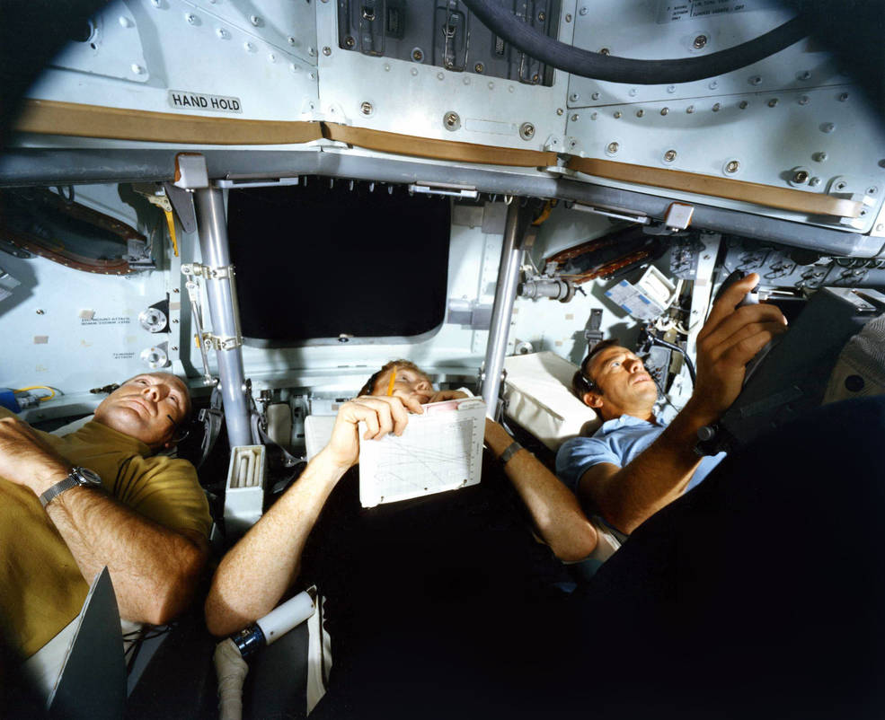 Left: Apollo 14 backup crewmembers (left to right) Cernan, Evans, and Engle during