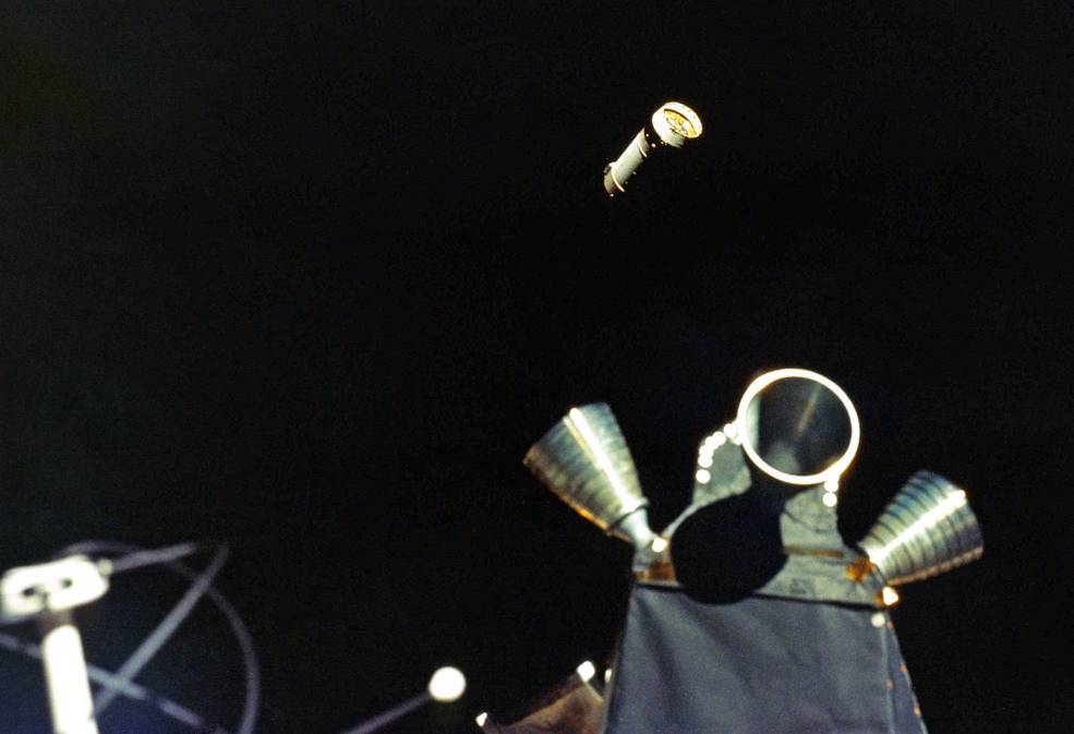 Left: The Apollo 14 Lunar Module Antares still attached to the Saturn V rocket’s third stage, that is venting leftover propellant. Right: Schematic view of the Apollo probe-and-drogue docking mechanism.