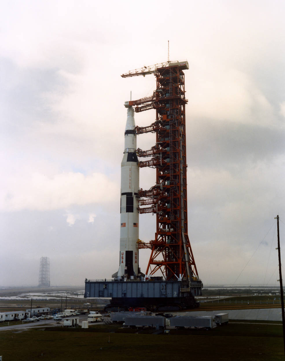 Left: The Apollo 16 Saturn V begins its rollback from Launch Pad 39A to the Vehicle Assembly Building (VAB) at NASA’s Kennedy Space Center in Florida. Right: The Saturn V nears the VAB during the rollback.