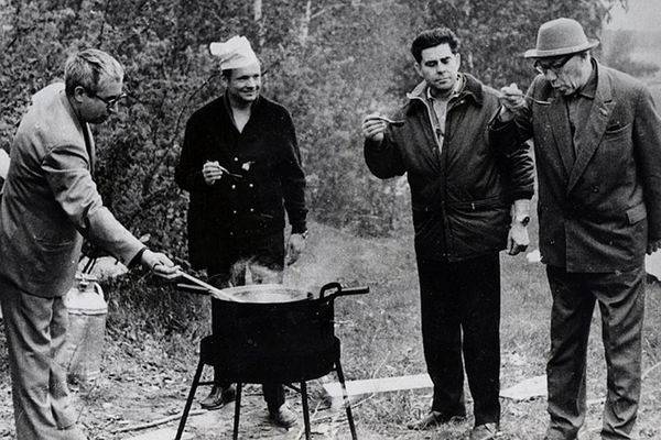 Scenes from the outing to the island on Ob Reservoir. Left: Cooking ukha.