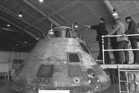 Left: Beregovoi and Feoktistov examine the Apollo 11 CM at NAR. Right: Beregovoi and Cernan inspect the Apollo 14 CM at NAR. Credits: NAR.