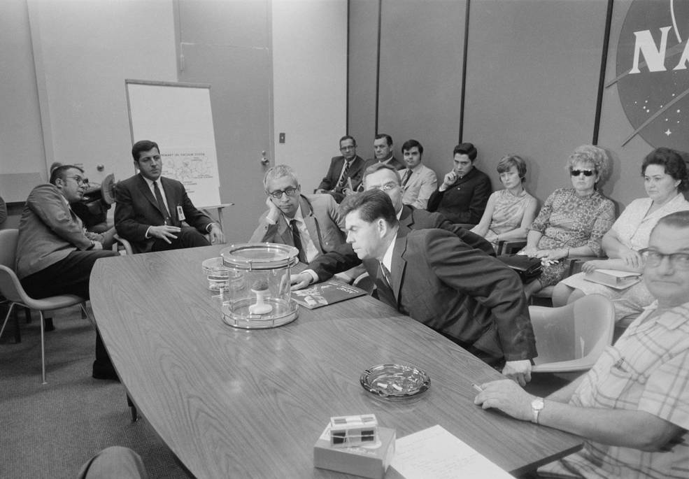 The next morning, Beregovoi and Feoktistov accompanied by Borman left New York for Washington, DC, where they met briefly with President Richard M. Nixon, Vice President Spiro T. Agnew, and Soviet Ambassador to the United States Anatoliy F. Dobrynin at the White House. President Nixon presented the two cosmonauts with presidential pens and inauguration medals. Then it was off to Houston for two days of visits and meetings at MSC. After arriving at nearby Ellington Air Force Base (AFB), Beregovoi and Feoktistov had the opportunity to inspect and sit in a T-38 Talon training aircraft, with Borman demonstrating its features. During their MSC visit, Flight Director Glynn S. Lunney toured them through Mission Control, explaining the various positions in the Mission Operations Control Room (MOCR). Astronaut Jack L. Swigert demonstrated the Apollo Command Module (CM) simulator, which Beregovoi tried out. The cosmonauts received a detailed briefing on the Apollo lunar spacesuit, and in the Lunar Receiving Laboratory’s conference room they had a chance to examine a Moon rock returned by Apollo 11. On Oct. 23, Beregovoi and Feoktistov gave an unprecedented press conference at MSC, with Borman joining them. A group of 30 astronauts held a dinner in their honor.
