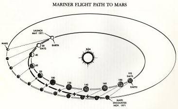 Left: A model of the Mariner 9 spacecraft. Right: Mariner 9’s trajectory from Earth to Mars.