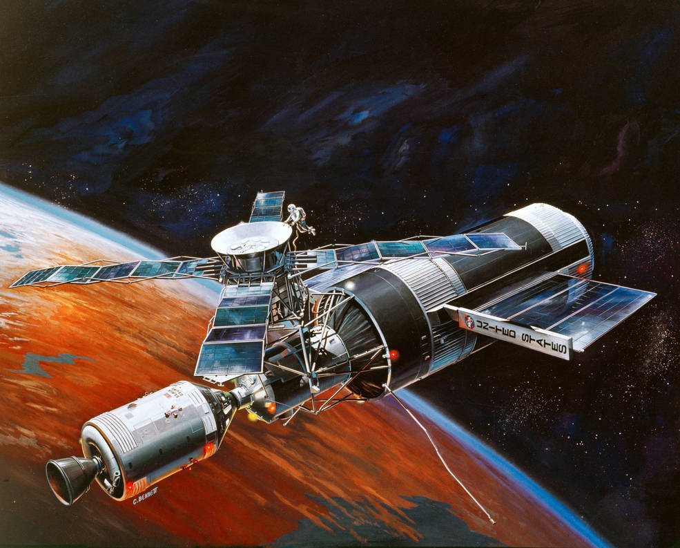 In July 1969, as the Apollo 11 astronauts were on their way to accomplish the first Moon landing, NASA Administrator Thomas O. Paine announced a decision to launch the AAP workshop, an experimental Earth orbiting space station, “dry” as opposed to “wet.” In the original “wet” plan, the workshop would launch as a fully-fueled second stage on a smaller Saturn 1B rocket, with astronauts in orbit outfitting the stage into living and working quarters. The “dry” workshop would launch already outfitted but the additional mass would require the use of a two-stage version of the larger Saturn V Moon rocket.