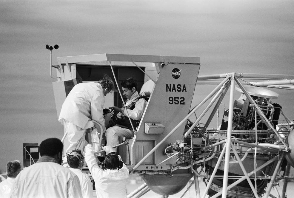 Left: Apollo 16 astronaut John W. Young trains for the descent to the Moon’s surface in the Lunar Landing Training Vehicle at Ellington Air Force Base. Right: Apollo 16 astronauts Young, Thomas K. “Ken” Mattingly, and Charles M. Duke pose for photographers after their last preflight press conference.
