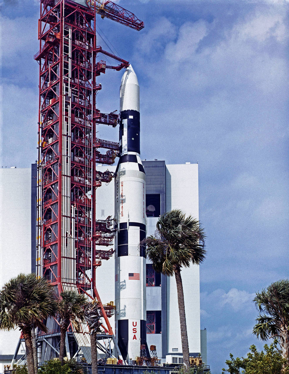Three views of the Saturn V rocket with the Skylab 1 space station mounted on top as it exits the Vehicle Assembly Building at NASA’s Kennedy Space Center in Florida to begin the three-mile journey to Launch Pad 39A.