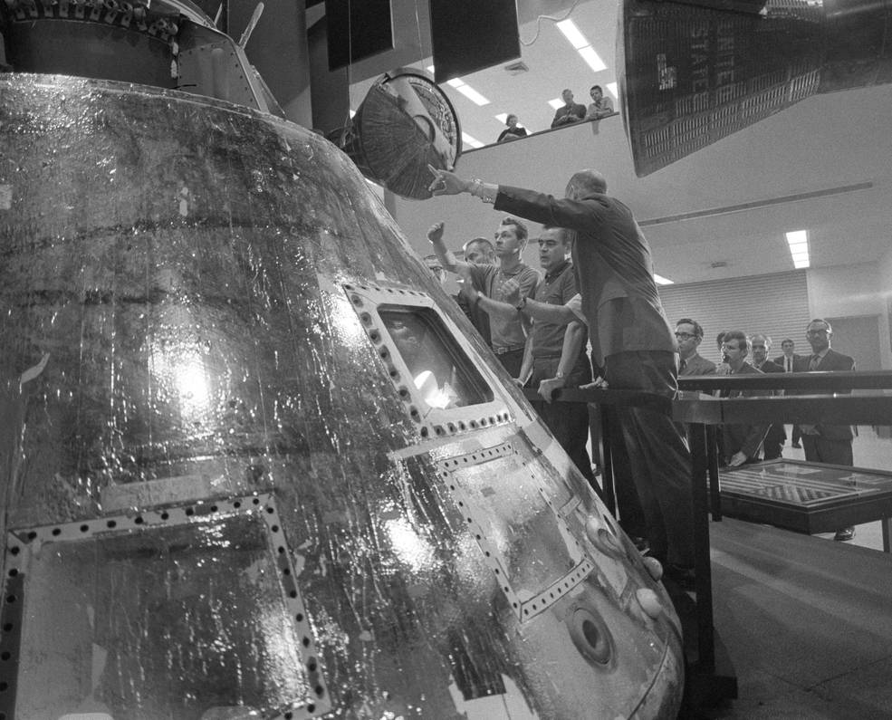 Middle: Thomas P. Stafford, right, points out features of the Apollo 9 Command Module