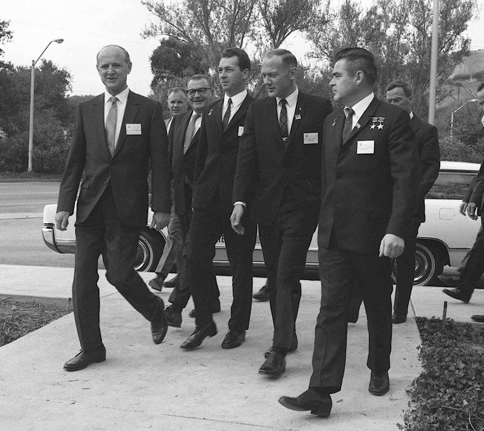 Today, we take for granted that astronauts and cosmonauts work together aboard the International Space Station, and have been doing so for 20 years. But it wasn’t always that way. During the Cold War in the 1960s and early 1970s, meetings between American astronauts and then-Soviet cosmonauts were rare events, often taking place when they happened to be attending the same international venue such as a scientific conference. President Richard M. Nixon’s space policy encouraged cooperation with other nations, including the Soviet Union. Thus began a series of astronaut and cosmonaut visits, beginning with Frank Borman’s trip to the USSR in July 1969, reciprocated with the visit of Georgi T. Beregovoi and Konstantin P. Feoktistov to the United States the following October. In May-June 1970, it was Neil A. Armstrong’s turn to take a goodwill tour of the USSR. While he visited the Gagarin Cosmonaut Training Center in Star City outside Moscow, the Soviets launched Andriyan G. Nikolayev and Vitali I. Sevastyanov aboard Soyuz 9 on a record-setting 18-day mission. Four months after their return to Earth, Nikolayev and Sevastyanov spent 10 days on a goodwill tour of the United States. While they toured the U.S., a NASA delegation met with their Soviet counterparts in Moscow to discuss possible future cooperation in human spaceflight, the initial step that led to the first joint docking in space less than five years later.