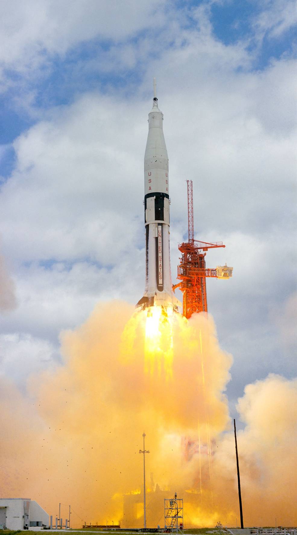 In 1966, to meet President John F. Kennedy’s goal of landing a man on the Moon before the end of the decade, NASA flew five crewed Gemini missions to demonstrate the techniques needed for the lunar landing mission. In parallel, NASA carried out uncrewed tests of the Apollo spacecraft and the Saturn rockets required to send humans to the Moon and return them safely to Earth. These included three flights of the Saturn IB rocket – AS-201 in February, AS-203 in July, and AS-202 in August – and the rollout to the launch pad of the first Saturn V test vehicle. The AS-202 mission, the third flight of the Saturn IB rocket, launched a fully operational Apollo spacecraft on a 90-minute suborbital mission to test the Command Module’s (CM) heat shield and life support systems and the Service Module’s (SM) power-generating fuel cells and main engine. Following the success of these test missions, NASA decided that the next Saturn IB rocket and Apollo spacecraft would carry a crew on an Earth orbital mission.