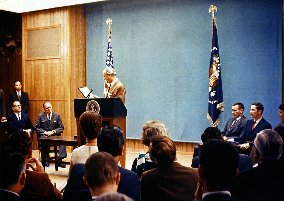 Left: On Nov. 3, 1968, at the LBJ Ranch in Johnson City, Texas, Acting NASA Administrator Thomas O. Paine, seated at left, listens as President Lyndon B. Johnson reads the commendation on the Exceptional Service Medals awarded to the Apollo 7 crew, seated at right. Right: Paine, at microphone, introduces the Apollo 8 crew during a postflight