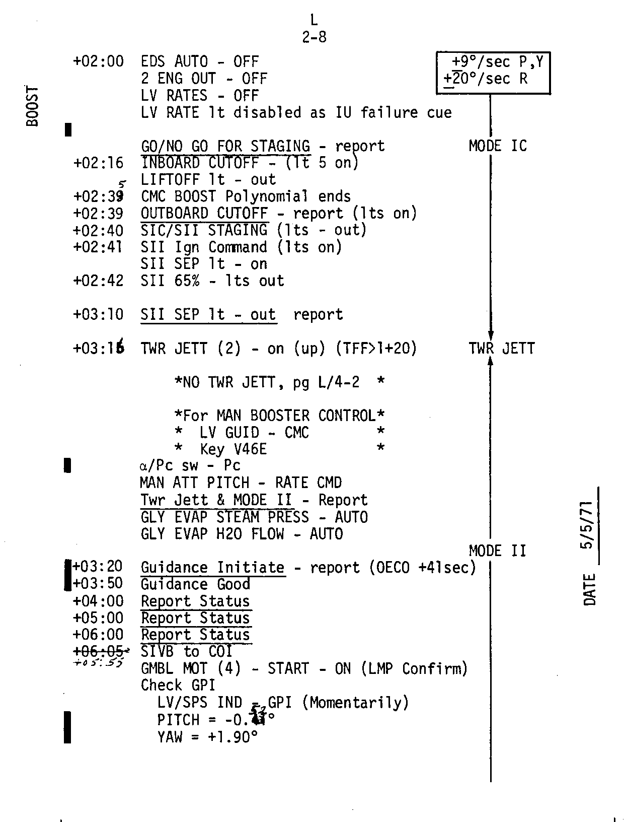 Scott, from 1998 correspondence: "The approved, required, authorized, etc. procedures during launch were on the cue cards. For A-15, there were 45 "CSM Cue Cards," all of which were prepared (in a single book) by the Crew Procedures Division. The Cue Cards represent the proper crew procedures when applicable. During launch, the A-15 CDR Cue Card indicated :00 - lift-off, and then next :11 - Roll. Therefore, in summary, there was no "yaw" transmission to the ground. How this got into the "checklist" I do not know, but as the missions wore on, "interested parties" were able to get into the loop. During the early days of Apollo, the crew only prepared the "checklist," which was later approved by the Crew Procedures Change Board. An interesting part of the Apollo 'culture.'"