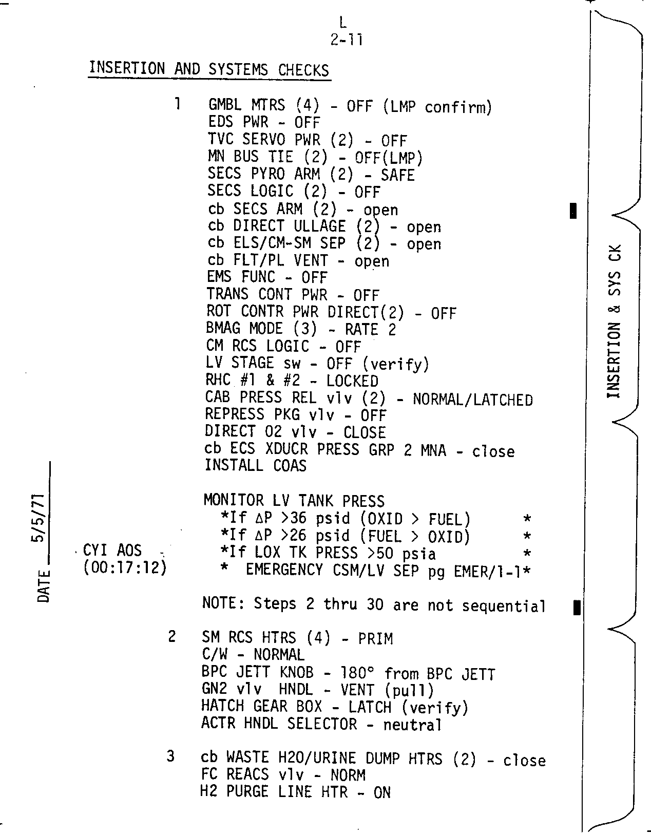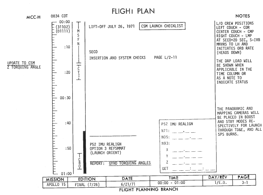 Before the voyage commences, there are two sections to the CSM Launch Checklist to be followed. The lift-off configuration is set and verified by the back-up CMP (Command Module Pilot), in this case Vance Brand, who checks that each switch, knob, adjustment and talkback indicator is correctly set for the arrival of the prime crew. The CSM launch Checklist systematically covers each of the 57 panels in the Apollo 15 CSM. There are 454 lines in the checklist. Some panels are covered by a single line, while panel 2 on the main display console requires 78 lines.