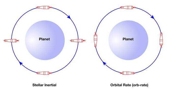 diagram to illustrate the difference between a stellar inertial attitude and an 'orb rate' attitude.