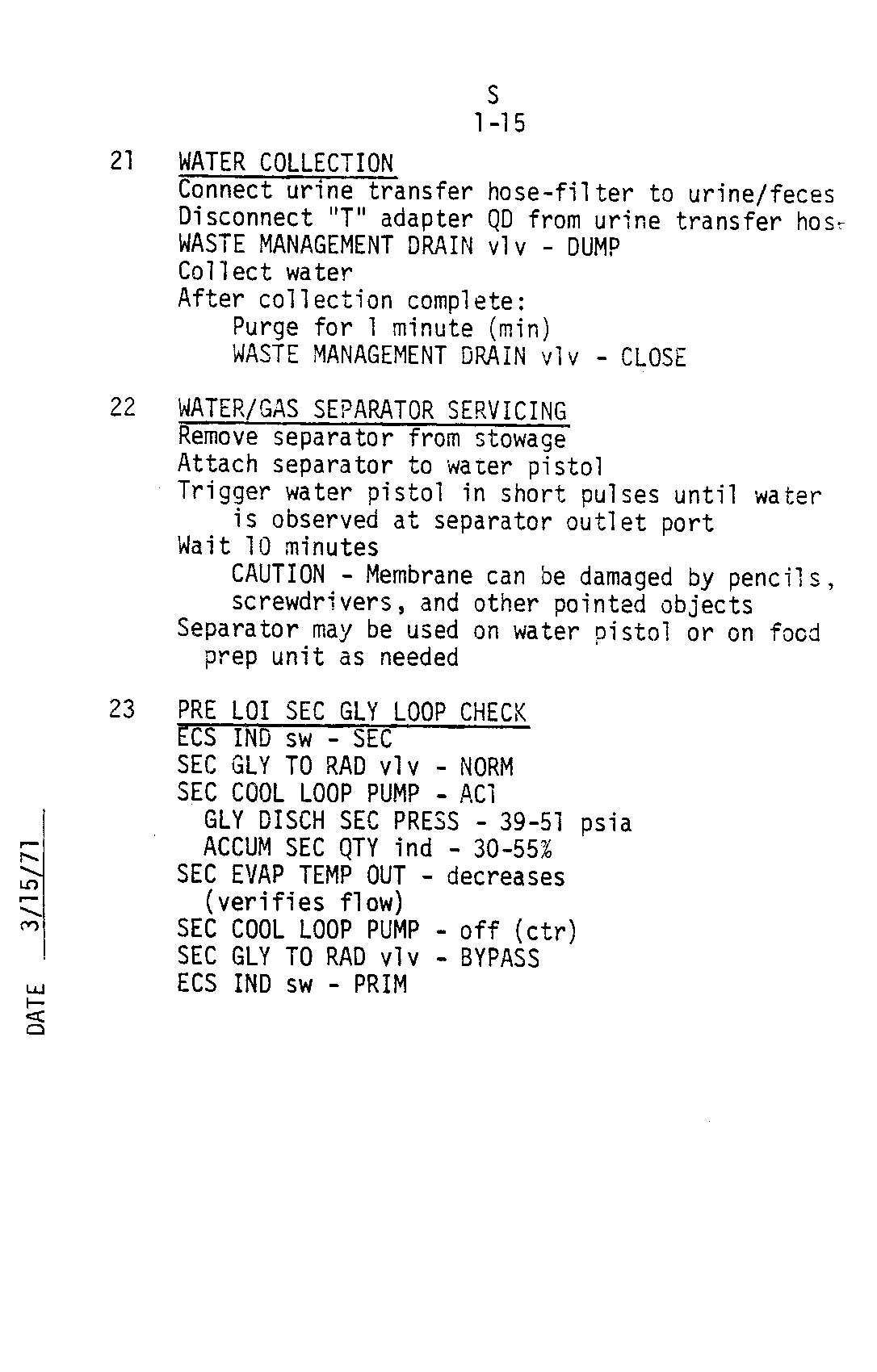 070:34:31 Parker: Roger. That's good. Okay. Next item at 71:15. This will be a line added in after the "CM/LM Pressure Equalization Decal." And the line says, "Press Equal valve, Close." Over. [Pause.]