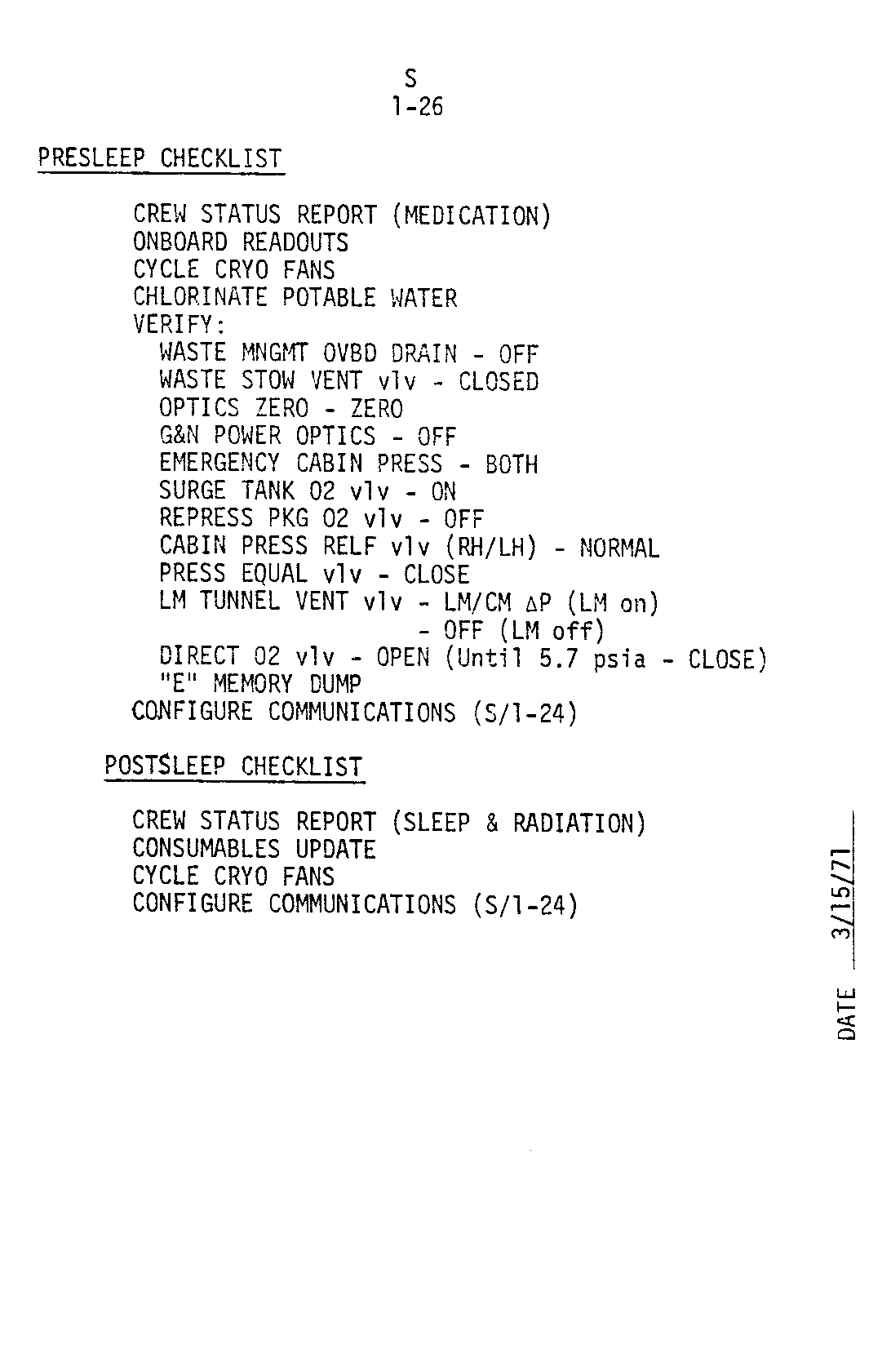 The Contingency Checklist carries a wide range of procedures which the crew can fall back on in an emergency situation. Some of these seem to be based on experience gained during Apollo 13 when the LM had to be powered up in a hurry and used as a lifeboat. A few examples of procedures covered are; a 30-minute activation of the LM, use of the AGS (Abort Guidance System) to set up a PTC, powering the CSM from the LM.