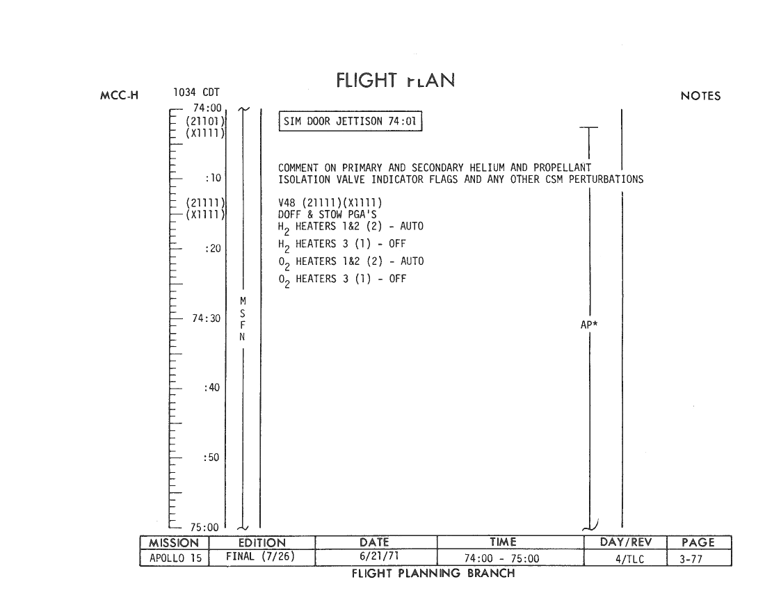 070:34:05 Irwin: Okay. Here's the readback, Bob. At 71 hours, "High Gain Antenna on MSFN cue, S-band Aux TV, to Science, Pan Camera Mode, to Standby." That's a "Verify." "Pan Camera Power, On; Pan Camera Self Test, to Heaters; Mapping Camera, On, to Standby; after five minutes, Pan Camera, Off, and S-band Aux, TV, Off."