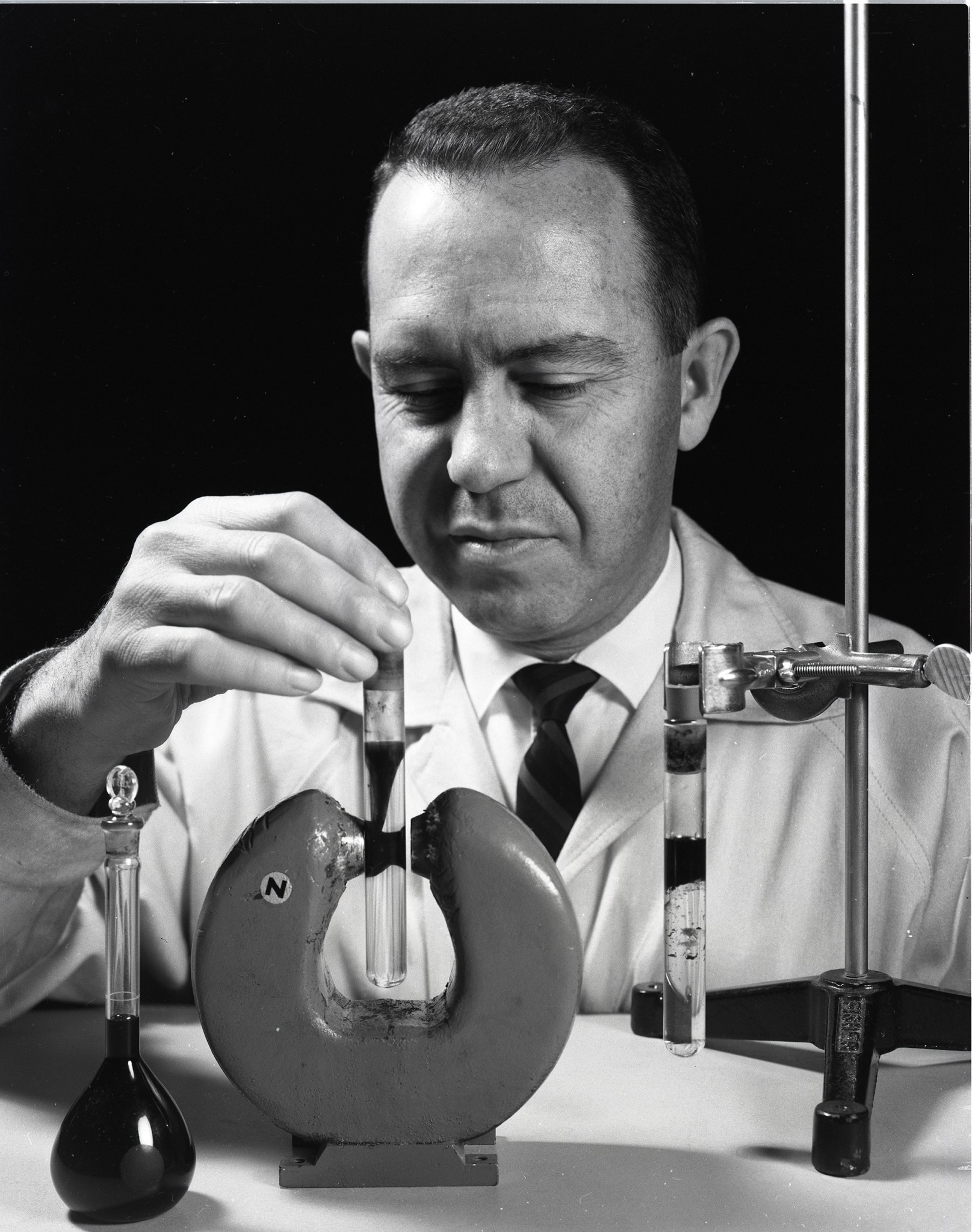 Inventor Stephen Papell demonstrates the effects of a magnetic field on a magnetic propellant mixed with water in 1963.