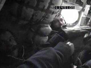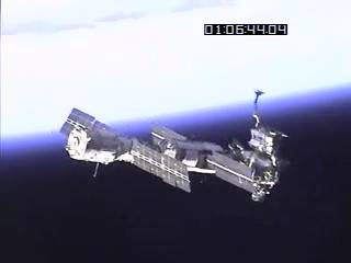 Gidzenko deftly guided their Soyuz TM31 spacecraft to a successful docking at the Zvezda Service Module’s aft port. The crew began equalizing the pressure between their spaceship and the ISS, and after some initial difficulties with opening the Soyuz orbital compartment hatch, they opened the first hatch to the ISS. As Shepherd filmed the event, Krikalev and Gidzenko entered Zvezda’s transfer chamber to await pressure equalization with the module’s main work compartment. Krikalev then opened the hatch and floated into Zvezda, turning lights on as he went, with Gidzenko and Shepherd following.