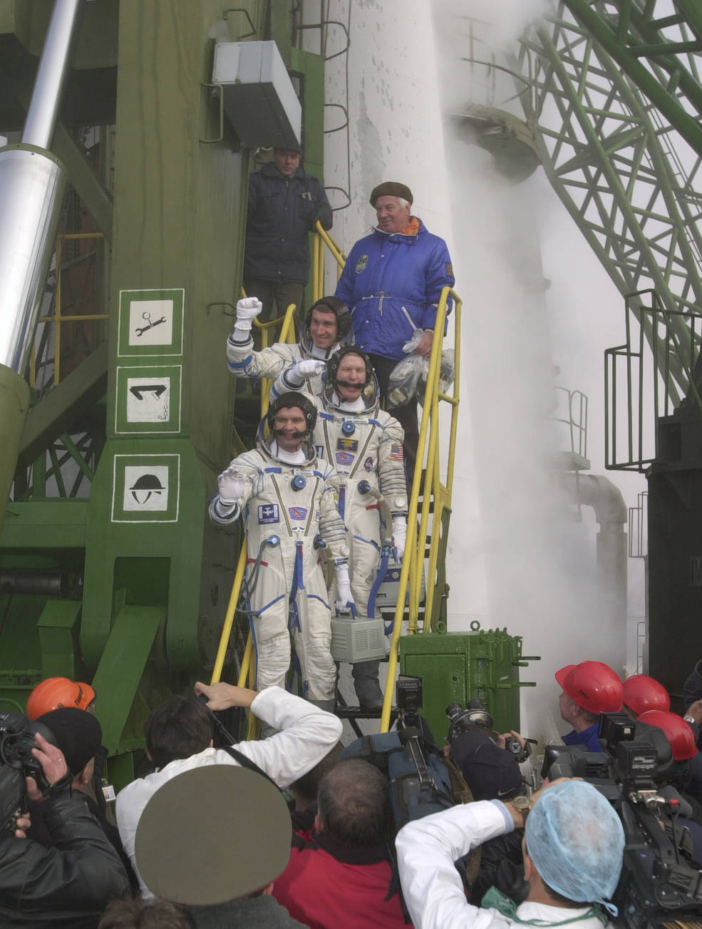 On launch morning, in the crew quarters at the Cosmonaut Hotel in Baikonur, the crew underwent brief medical exams and received the traditional prelaunch blessing from Russian Orthodox priest Father Sergei. They boarded a bus for the Baikonur Cosmodrome’s Building 254 where they donned their Sokol launch and entry suits. Technicians assisted them in verifying the pressure integrity of their suits. Through a glass partition, they addressed an assembled crowd of American and Russian space officials and members of the press. Outside the building, Gidzenko reported to the Chairman of the State Commission on the crew’s readiness to undertake the mission. They then boarded the bus to the launch pad.