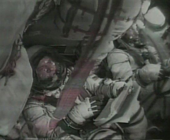 Left: Still image from downlink video of Yuri P. Gideznko, left, and Sergei K. Krikalev inside their Soyuz TM31 spacecraft during the ascent to orbit. Right: Still image from downlink video of William M. Shepherd and Yuri P. Gidzenko during the ascent to orbit.