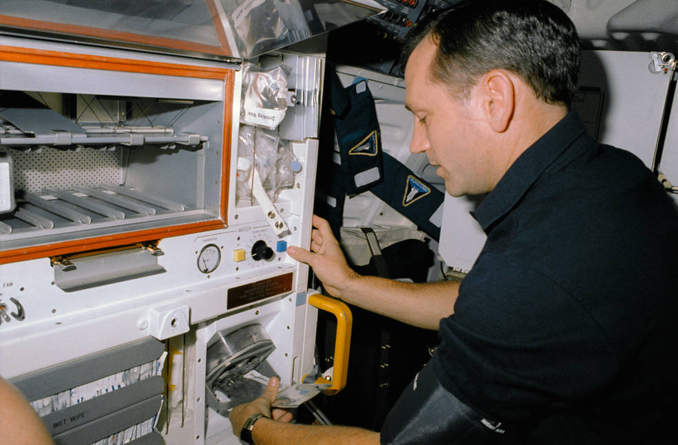 During the Apollo-Soyuz Test Project (ASTP) in 1975, American astronauts sampled Russian space food for the first time as crewmembers shared meals during two days of docked activities. Much of the food aboard the Soviet Soyuz came in tubes, and Soviet Commander Aleksei A. Leonov played a prank on American astronauts Thomas P. Stafford and Donald K. “Deke” Slayton by replacing the labels on tubes of borsch with labels from famous Russian vodkas. With the advent of the Space Shuttle in 1981, the availability of a galley to both rehydrate and reheat foods made the astronauts’ menus more palatable and varied. The lack of refrigeration on the other hand required most food items to be dehydrated or thermostabilized, apart from a small locker of fresh food intended for immediate consumption.