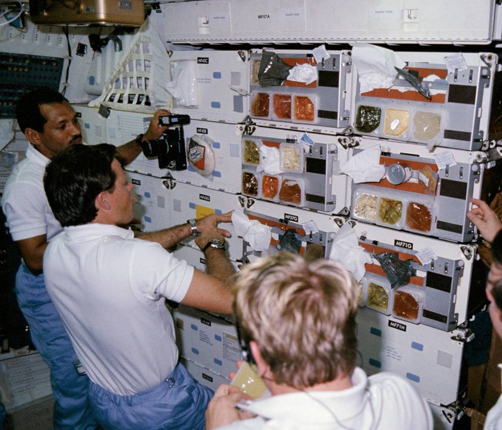 Right: Astronauts (left to right) Charles F. Bolden, Robert L. Gibson, and George P. Nelson preparing meals for their STS-61C crewmates.
