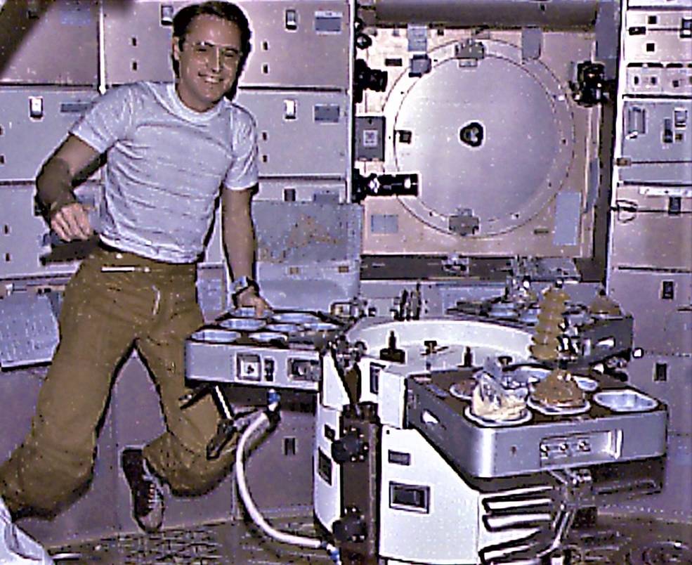 Right: Skylab 4 astronaut Edward G. Gibson at the Skylab galley.