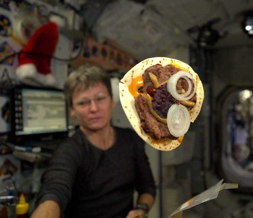 Right: Expedition 51 Commander Peggy A. Whitson showing off the hamburger she prepared using a tortilla.