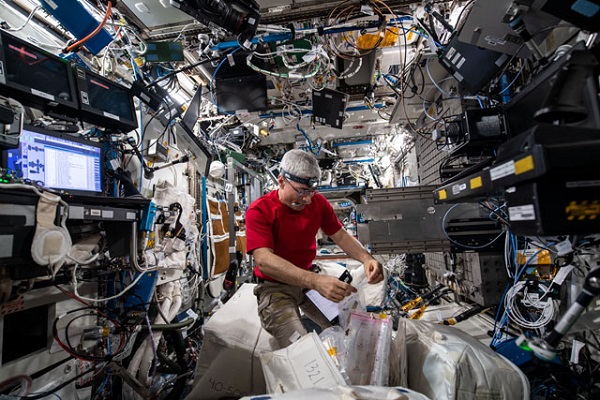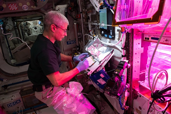 On future long-duration missions, crews will grow food to supplement what they bring from Earth. Researchers have used the space station to study the challenges of growing plants in microgravity, examining the formation and growth of roots and leaves, analyzing genetic changes, and testing growth and watering systems. During Vande Hei’s time on station, he participated in the first (and second) harvest of chile peppers grown in space for the Plant Habitat-04 study. The top image shows Vande Hei with NASA astronauts Shane Kimbrough and Megan McArthur and JAXA astronaut Akihiko Hoshide as they share some of the peppers. The APEX-7 investigation analyzed the role of RNA regulation on gene expression during spaceflight in both roots and shoots of plants. In the bottom image, Vande Hei harvests APEX-7 seedlings to prep for analysis.