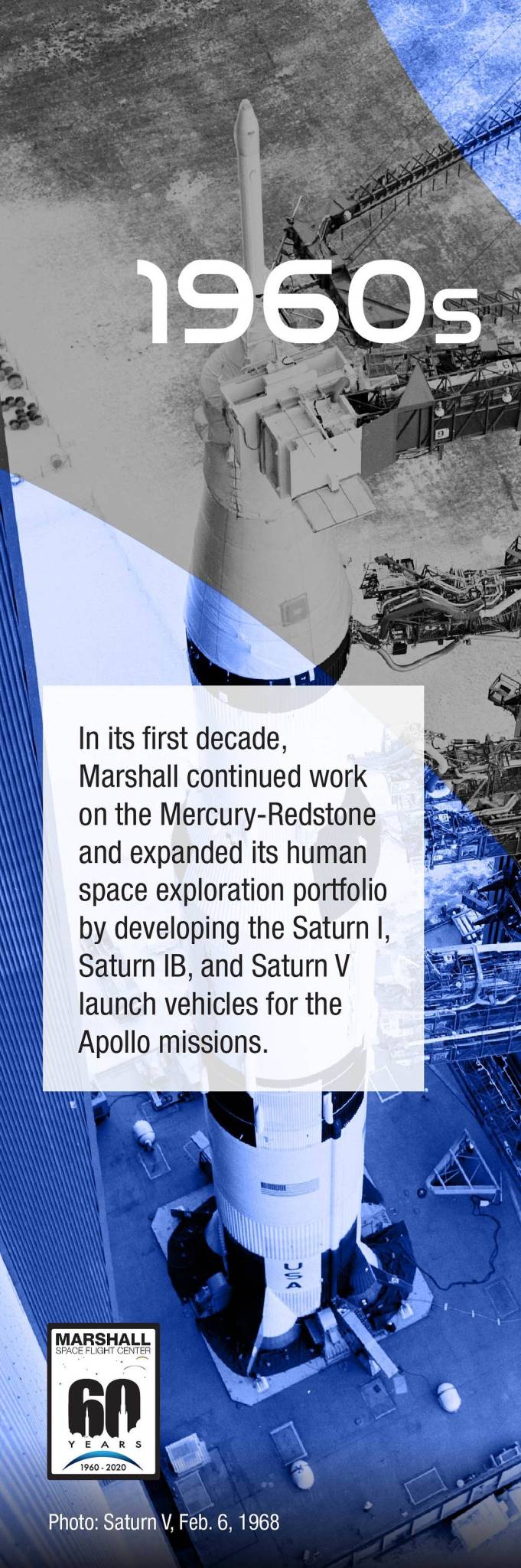 In its first decade as a NASA center, Marshall continued the Army’s work on the Mercury-Redstone vehicle which launched the country’s first astronaut, Alan Shepard into space. However, the majority of Marshall activities in propulsion concerned the development of the Saturn I, Saturn IB, and the Saturn V launch vehicles for the Apollo Program.