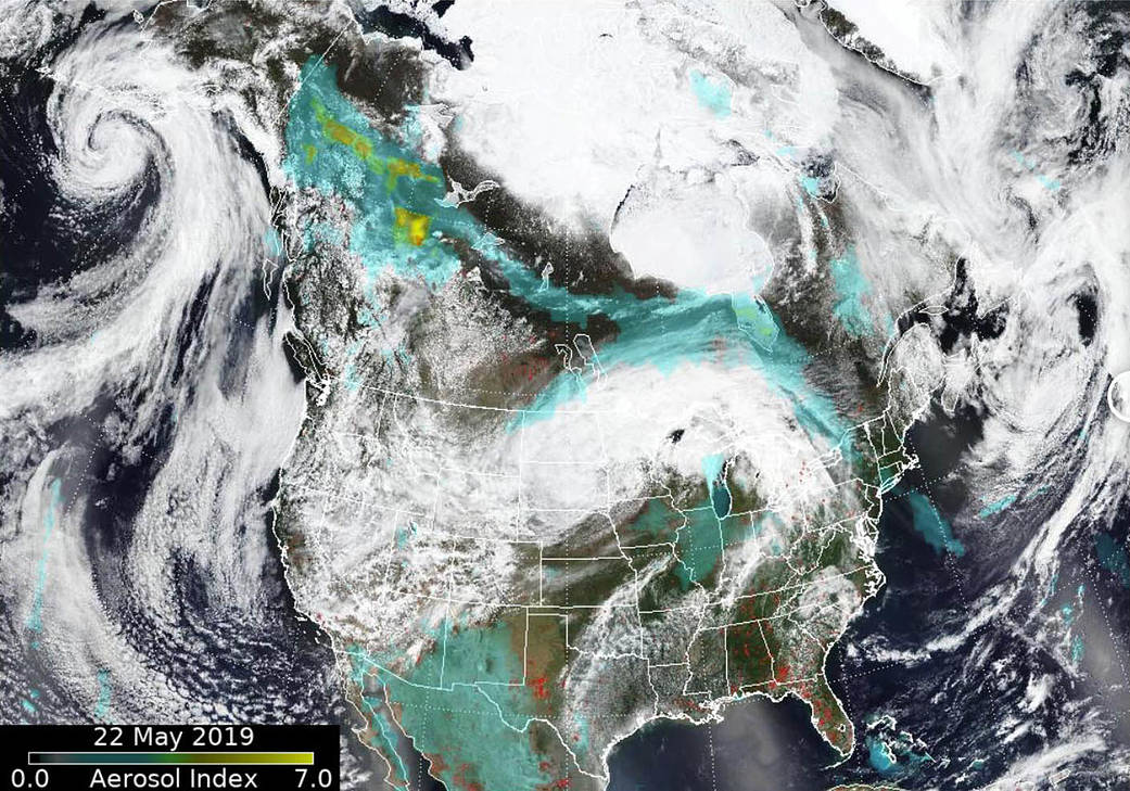 NASA’s Earth Observing System Data and Information System (EOSDIS) Worldview application provides the capability to interactively browse over 700 global, full-resolution satellite imagery layers and then download the underlying data. Many of the available imagery layers are updated within three hours of observation, essentially showing the entire Earth as it looks “right now.” This image used data obtained on May 22, 2019 from both the Ozone Mapping and Profiler Suite (OMPS) sensor and the Visible and Infrared Imaging Sensor (VIIRS) onboard the Suomi NPP satellite. The underlying image was created using the red, green, and blue wavelength measurements from VIIRS. Actively burning fires are detected using the thermal bands from VIIRS and are shown as red points. OMPS data was used to produce the aerosol index. Image Courtesy: NASA Worldview, Earth Observing System Data and Information System (EOSDIS). Caption: Dr. Colin Seftor/Lynn Jenner with information from several news agencies