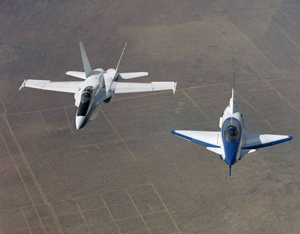 A head-on view of the X-31 Enhanced Fighter Maneuverability Demonstrator aircraft (right), accompanied by a NASA F/A-18 chase aircraft during a research flight over the desert floor. The X-31 had a three-axis thrust-vectoring system, coupled with advanced flight controls, to allow it to maneuver tightly at very high angles of attack.1994NASA Photo / › 1990s Fleet Description
